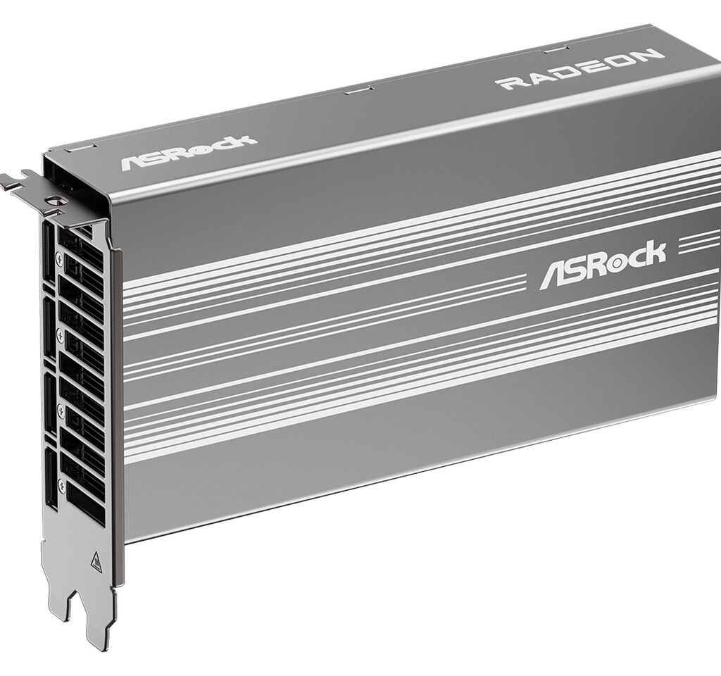 ASRock разместила свои варианты более заметно. На страницах присутствует предупреждение: «модель предназначена только для корпоративных клиентов, продажа в розницу запрещена». Дизайн карт выдержан в серебристых тонах с белой маркировкой и декоративными полосами на R9700S, младшая карта оформлена более светлым оттенком. Обе карты используют пассивное охлаждение с испарительной камерой и термопрокладки Honeywell PTM7950 для GPU и памяти, а маркировка «Super Alloy Graphics Card» указывает на использование премиальных материалов.