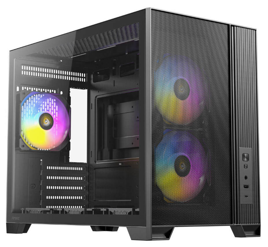 Панель ввода-вывода предлагает набор актуальных разъёмов, включая USB 3.0, USB Type-C 3.2 Gen 2 и комбинированный аудиоджек. Корпус оснащён пылевыми фильтрами сверху и снизу, двумя универсальными отсеками для накопителей и пятью слотами расширения. Каркас выполнен из стали и пластика, а боковая стенка из закалённого стекла позволяет демонстрировать собранную систему.
