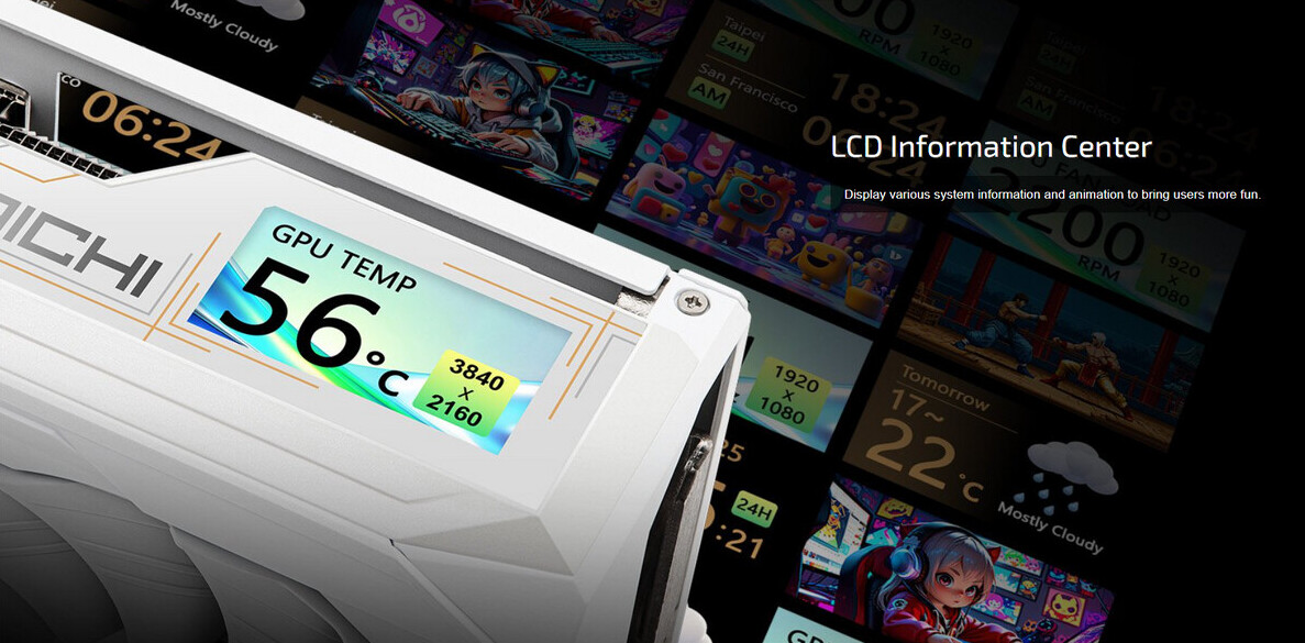 Ключевым отличием обновлённой версии стала интеграция нового элемента под названием LCD Information Center. Речь идёт о компактном двухдюймовом цветном дисплее, размещённом на боковой стороне видеокарты, который способен отображать диагностическую информацию, а также анимации и пользовательские визуальные эффекты. В дополнение к этому ASRock расширила зону ARGB-подсветки, добавив более длинную световую полосу на верхней части кожуха. Новый световой акцент органично вписывается в фирменную «шестерёнчатую» эстетику серии Taichi и подчёркивает статус флагманского решения.
