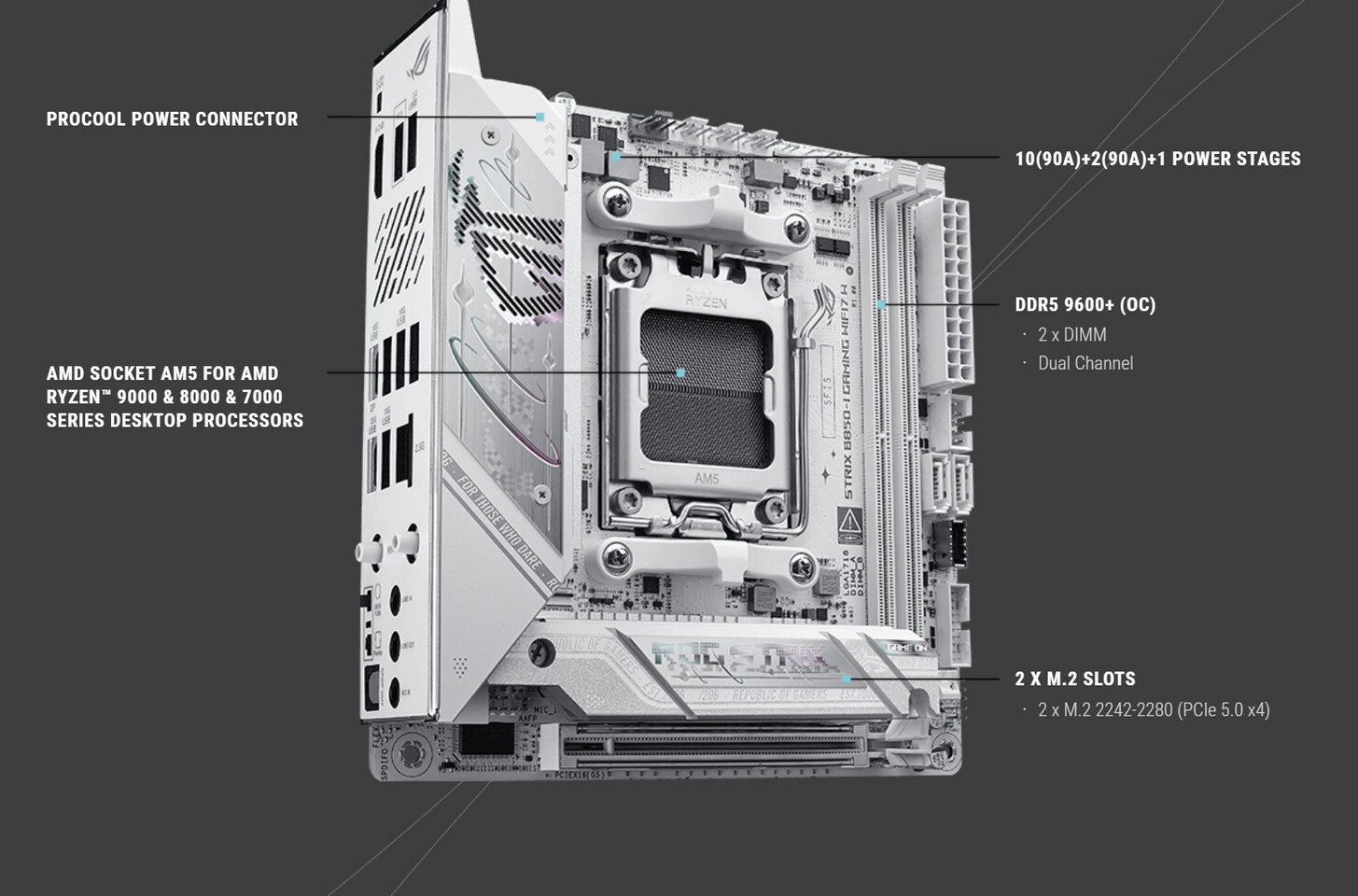 Техническое описание практически полностью совпадает с уже знакомой чёрной моделью: компактная плата Mini-ITX интегрирует современные интерфейсы, включая поддержку PCIe 5.0 для графики и накопителей, оснащается двухканальной DDR5-памятью и усиленной подсистемой питания, рассчитанной на высокие игровые нагрузки и ресурсоёмкие рабочие сценарии. Использование Wi-Fi 7 обеспечивает быстрый беспроводной доступ, а фирменные системы охлаждения должны удерживать производительность на стабильном уровне даже под длительной нагрузкой.