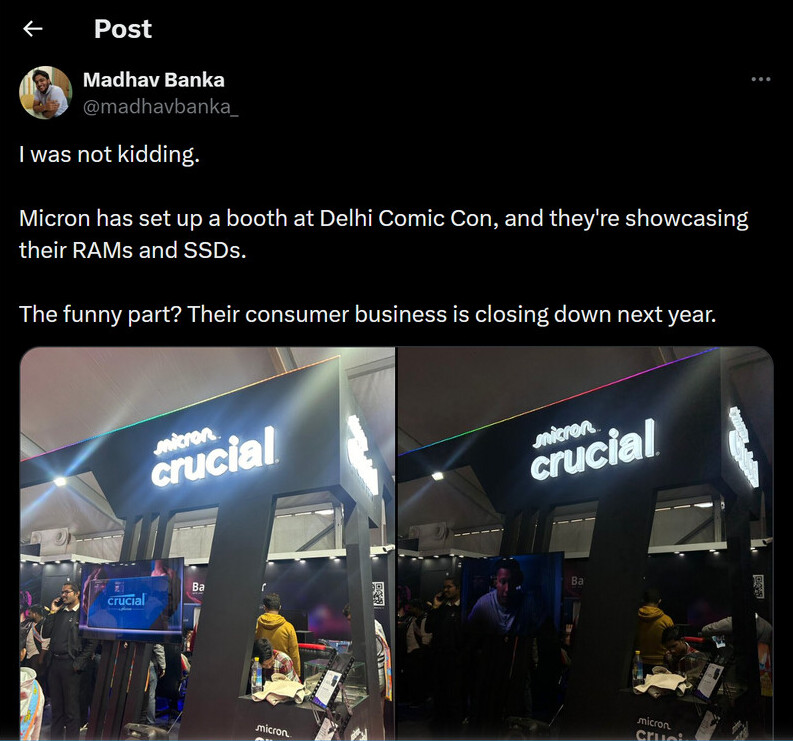 На фоне этих новостей особенно сюрреалистично выглядело присутствие Crucial на Comic Con India. Посетители Дели заметили стенд бренда, хотя он не значился в списке официальных участников. Один из очевидцев, Мадхав Банка, сначала сообщил об этом в соцсетях с долей иронии, а затем опубликовал снимок, подтвердивший присутствие Crucial. По его словам, представители компании демонстрировали привычный ассортимент — оперативную память и твердотельные накопители, — несмотря на то что через год эта линейка должна исчезнуть с потребительского рынка.