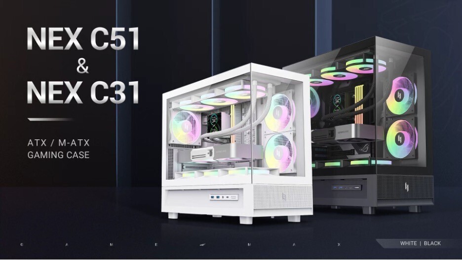Компания GAMEMAX объявила о запуске двух новых корпусов для ПК — NEX C51 и NEX C31, ориентированных на геймеров и энтузиастов сборки, которые хотят превратить системный блок в полноценный элемент визуального шоу. Обе модели выполнены в панорамном формате без угловых стоек, с двумя панелями из закалённого стекла, что обеспечивает цельный и ничем не перекрытый обзор внутренних компонентов.
