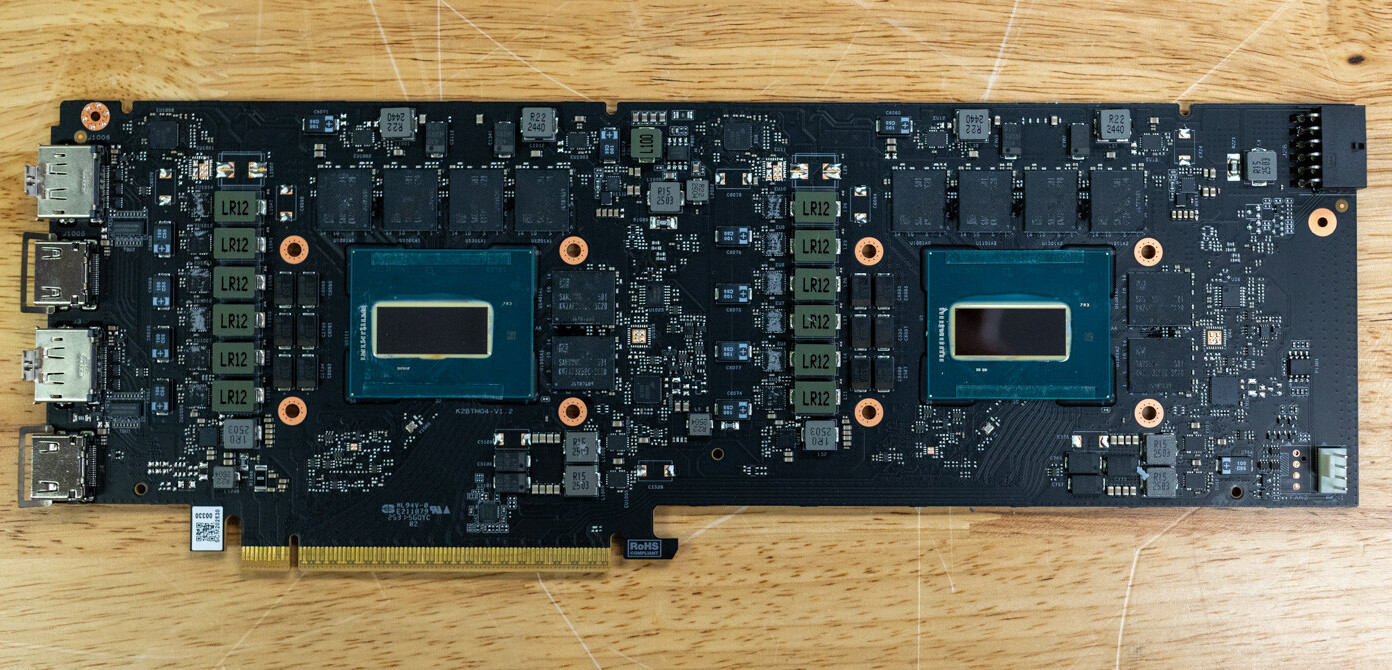 Maxsun использует двухчиповую компоновку и blower-кулер в серии Turbo Fan Edition, которые рассчитаны на плотную установку в рабочих станциях. Ранее компания показывала и более тонкую Liquid Edition с жидкостным охлаждением. В тестовой конфигурации Project Battlematrix работает сразу на четырёх видеокартах традиционной модификации B60, что создаёт ряд инженерных особенностей. По данным Storage Review, каждая из двух GPU в составе платы определяется системой как отдельное устройство, что требует поддержки PCIe x8/x8 bifurcation от материнской платы. Один слот PCIe x16 в таком режиме электрически делится на две независимые линии по x8, обеспечивая каждому графическому процессору собственную полосу пропускания. Разобранный образец Maxsun, как выяснилось, использует двухслотовый корпус длиной 300 мм и питается через один разъём 12V-2×6, обеспечивая до 400 Вт энергопотребления. Это один из первых случаев, когда профессиональная видеокарта Intel демонстрирует столь плотную и энергоёмкую интеграцию в двухчиповом исполнении.