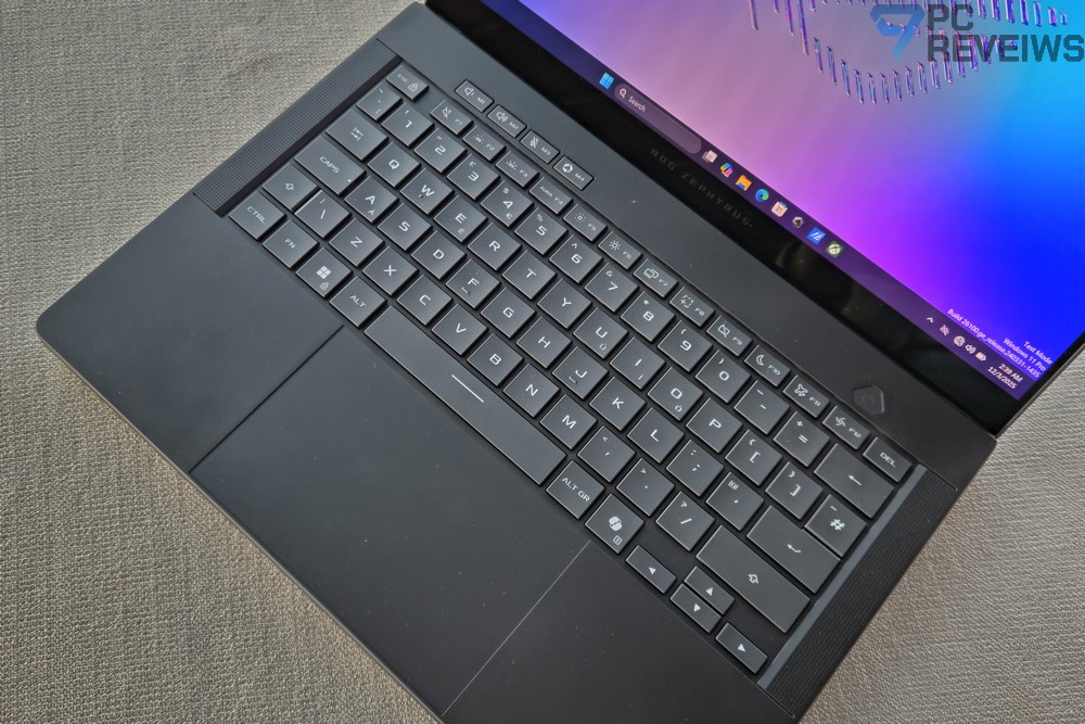 Если поставить модель 2026 года рядом с прошлогодней, отличия во внешности будут минимальными. Корпус по-прежнему выполнен из цельного алюминия, обработанного на CNC-станках, с тем же узнаваемым силуэтом и пропорциями. Геометрия крышки, форма панелей, расположение портов — всё это знакомо тем, кто уже работал с Zephyrus предыдущих поколений. ASUS слегка доработала нижнюю крышку и вентиляционные отверстия, но это скорее инженерные правки, чем визуальные изменения.