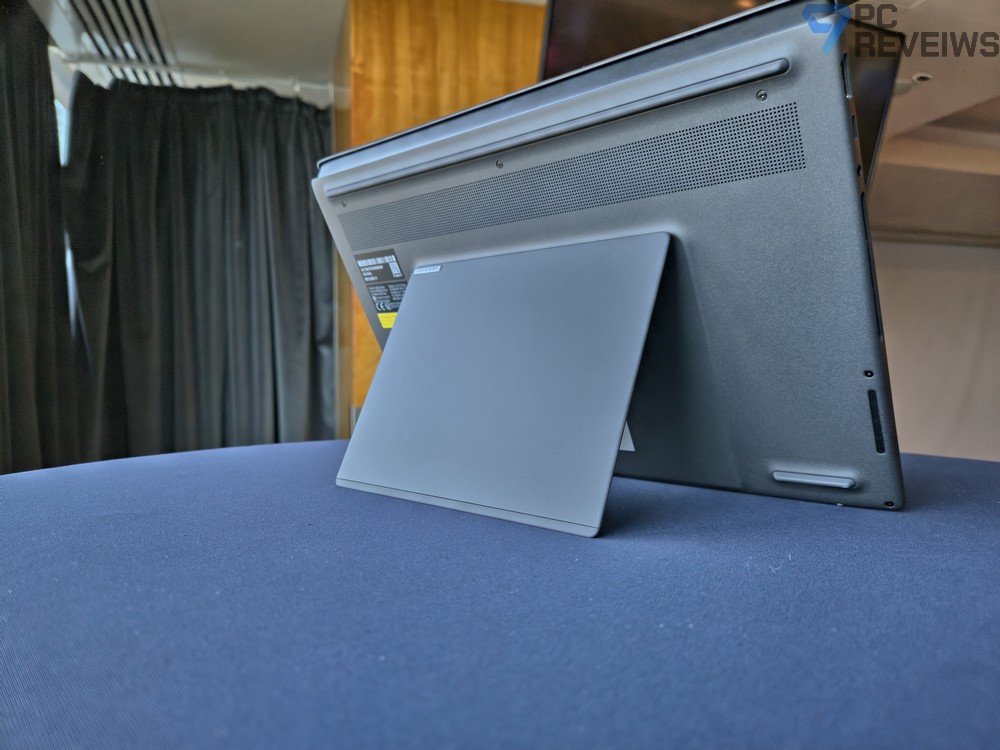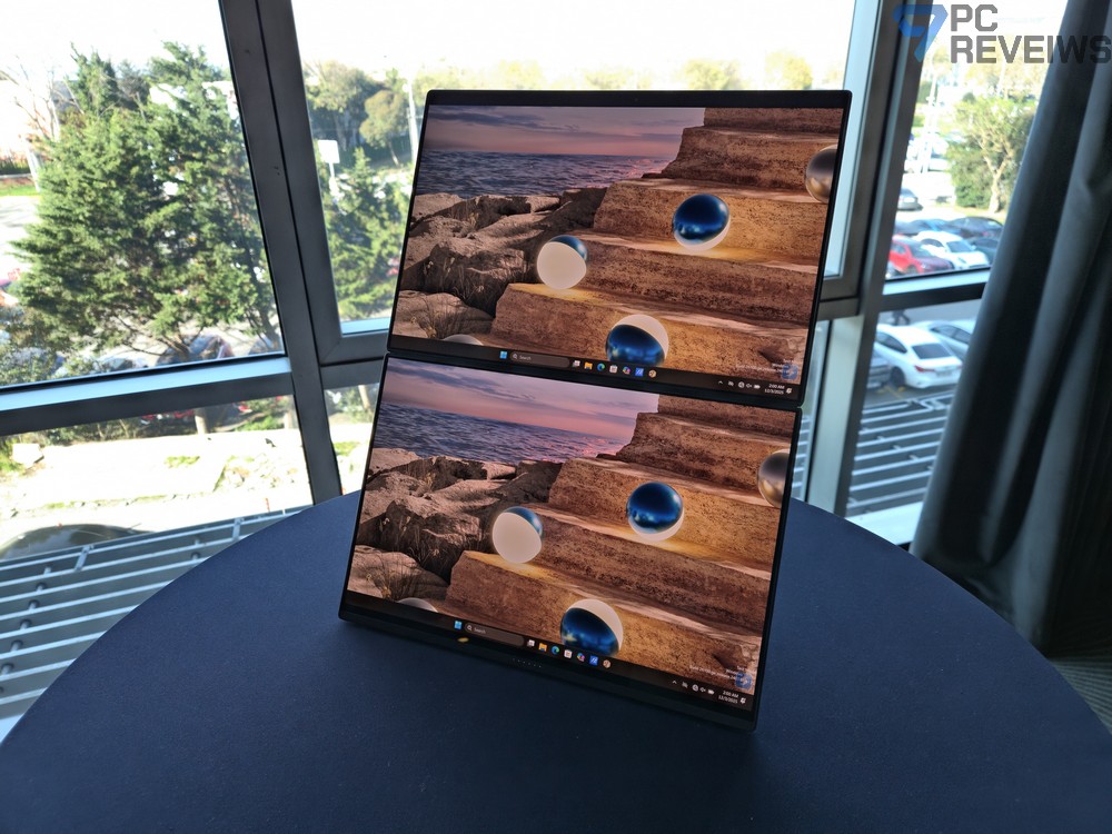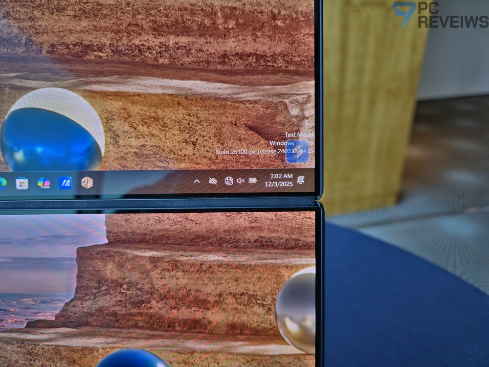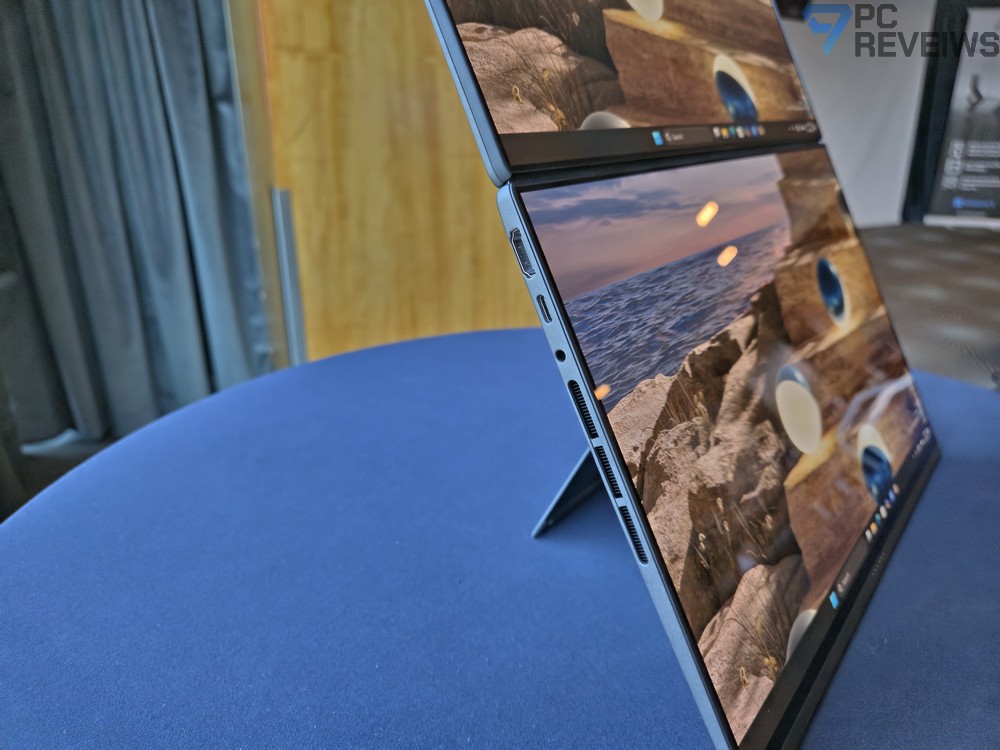 Новая конструкция шарнира позволяет верхнему дисплею подниматься под оптимальным эргономичным углом, при этом нижний экран остаётся доступным для управления и сенсорных действий. Когда верхний экран полностью опущен на нижний, создаётся практически единая рабочая поверхность, что делает чтение, редактирование текста и работу с графикой более естественными и комфортными. Такой подход снижает нагрузку на шею и глаза, поскольку пользователь меньше склоняется над устройством, а пространство между дисплеями теперь воспринимается как единый визуальный поток.