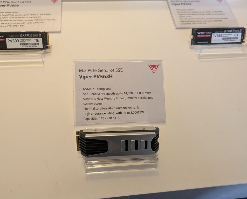 Накопитель построен на 6-нм контроллере Silicon Motion и предлагается в вариантах объёмом 1, 2 и 4 ТБ. По заявленным характеристикам, PV563H обеспечивает скорость последовательного чтения до 14 ГБ/с и записи до 11 ГБ/с, что на данный момент является рекордом для DRAM-less решений на базе PCIe 5.0. Для поддержания стабильной работы при высоких нагрузках используется пассивный алюминиевый радиатор, однако для систем с собственным охлаждением предусмотрена и версия без теплораспределителя, которая получила обозначение Viper PV563.