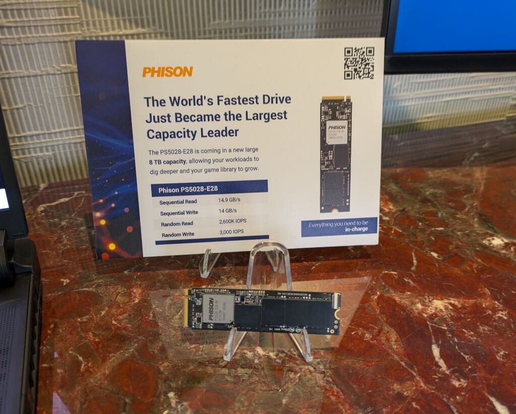Не менее интересной оказалась и вторая новинка — PS5028-E28, новый флагманский контроллер Phison для клиентских SSD. Он оснащён восемью каналами флеш-памяти, поддерживает накопители объёмом до 8 ТБ и использует DRAM-кеш DDR4, что обеспечивает высокий уровень производительности в случайных операциях. Эталонный 8-терабайтный SSD на базе E28 показал до 14 919 МБ/с при чтении и 14 008 МБ/с при записи, а заявленные показатели достигают 2,6 млн IOPS при случайном чтении и до 3 млн IOPS при записи.