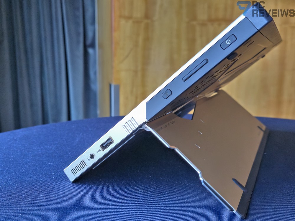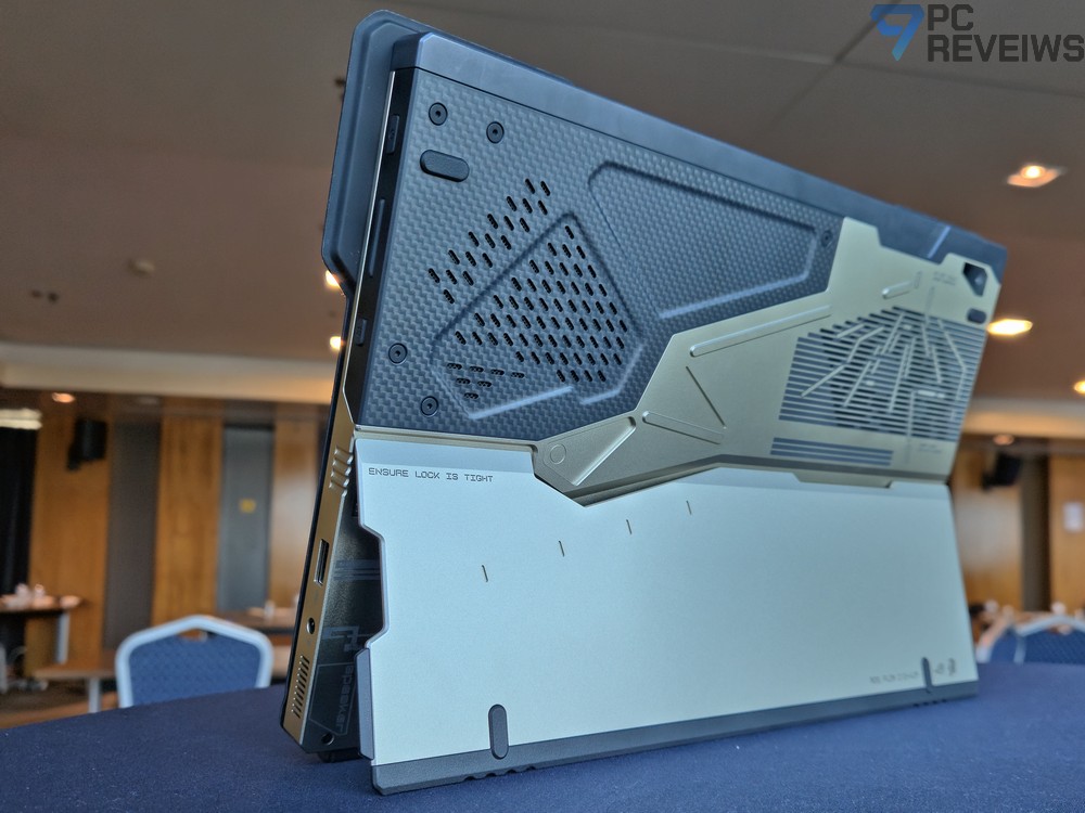 Форм-фактор планшета диктует и внутреннюю архитектуру устройства. Вся аппаратная платформа сосредоточена за дисплеем, а не под клавиатурой, как в классическом ноутбуке. Это позволяет Flow Z13 сохранять компактные габариты и относительно небольшую толщину, но одновременно требует иной логики охлаждения и компоновки внутренностей. Откидная металлическая ножка на задней панели — не просто аксессуар, а ключевой элемент конструкции. Она обеспечивает устойчивость на столе, позволяет точно подобрать угол наклона и играет роль в организации воздушных потоков, приподнимая корпус над поверхностью.