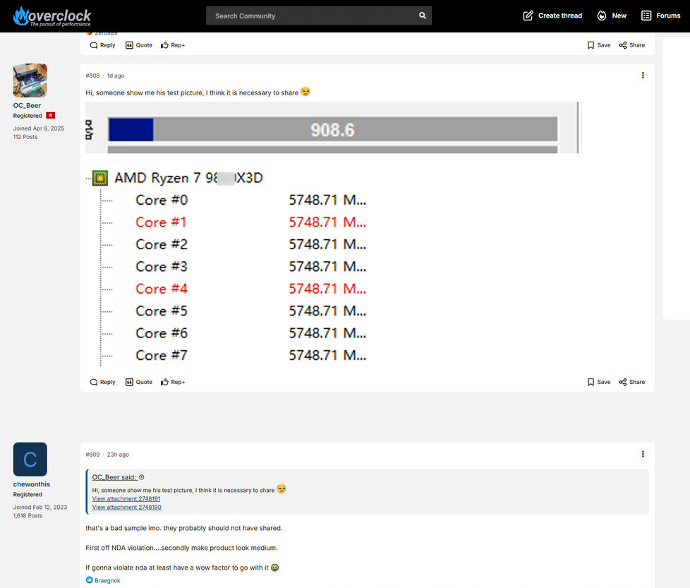 В ветке, посвящённой материнской плате Gigabyte X870 AORUS TACHYON ICE, пользователь под ником OC_Beer опубликовал скриншот, полученный, по его словам, от знакомого, имеющего доступ к инженерному экземпляру процессора. Несмотря на частично скрытое обозначение модели, все признаки указывают на Ryzen 7 9850X3D. На изображении видно, что все восемь ядер процессора одновременно достигают максимальной частоты 5748,71 МГц, что заметно превышает заявленный AMD эталонный boost-уровень в 5,6 ГГц.