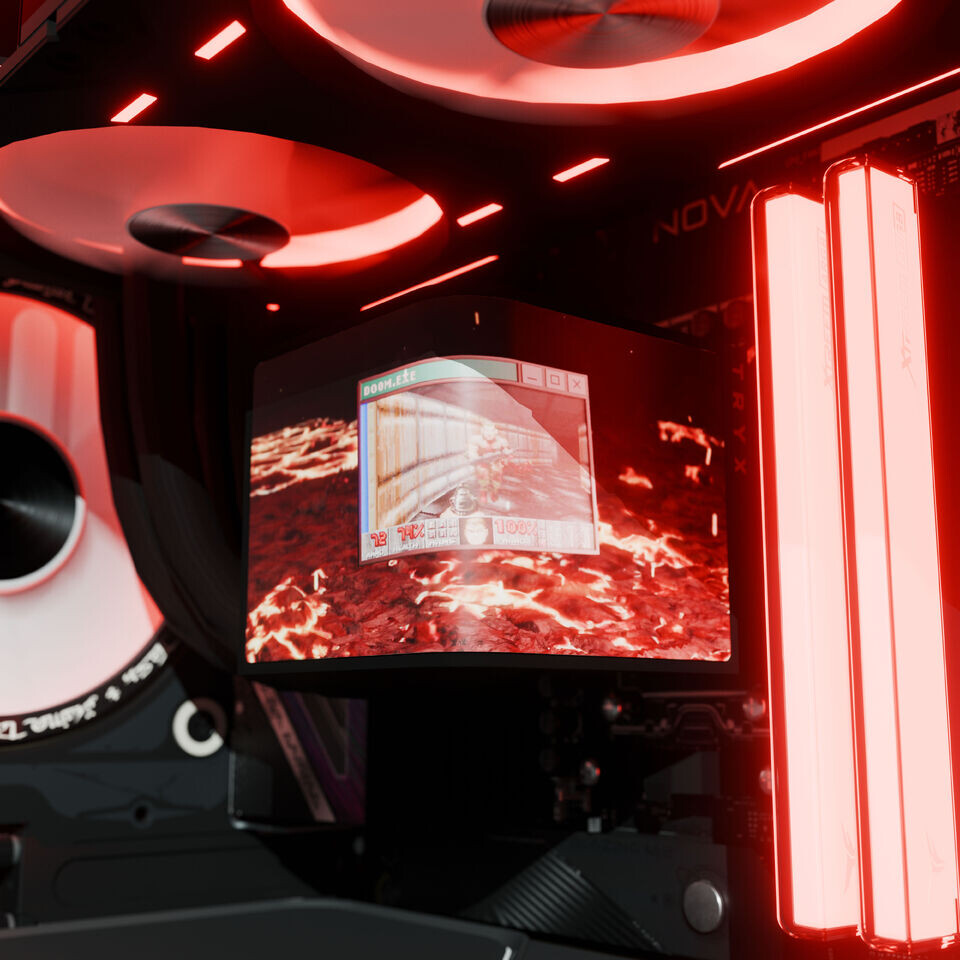 Впервые в ПК от MAINGEAR использована система жидкостного охлаждения TRYX PANORAMA SE 360 «всё в одном». Её уникальная особенность — встроенный антибликовый LCD-дисплей, который непрерывно транслирует классический геймплей DOOM, отдавая дань уважения культовой франшизе и поднимая эстетику системы на уровень элитных сборок.