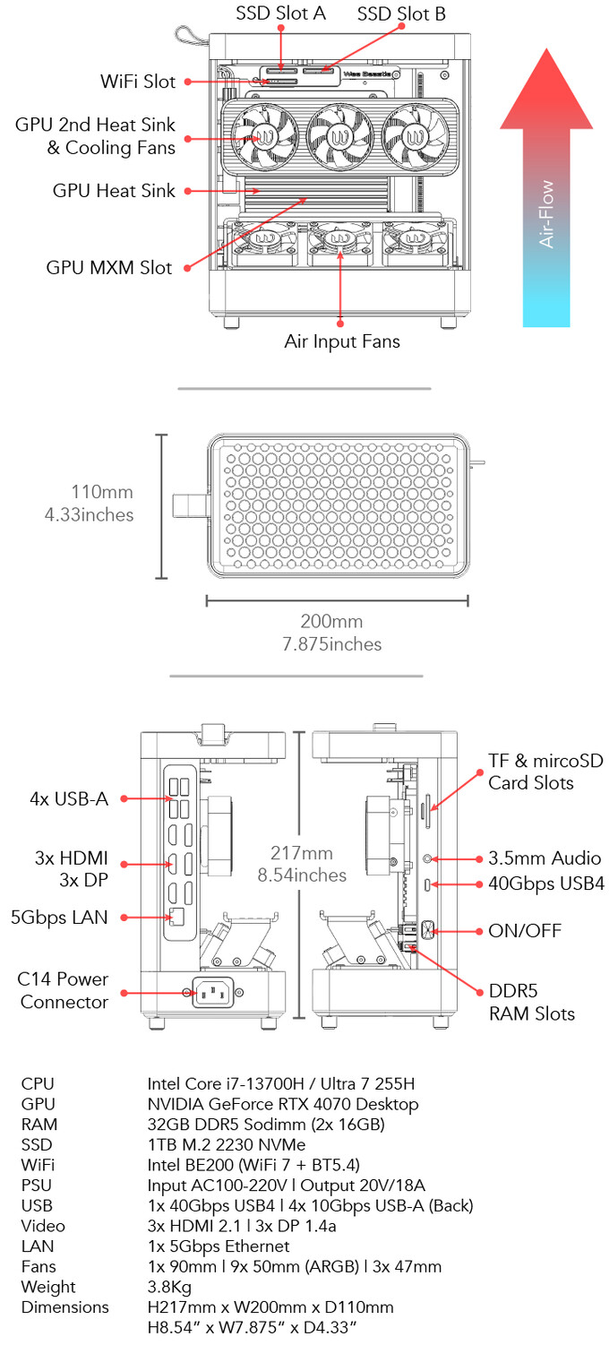 Тем не менее, маркетинговые материалы уже на этапе предзаказа вызывают некоторые вопросы. Wee Beastie оснащен внутренним блоком питания мощностью 400 Вт, что технически ниже рекомендуемых 550 Вт для настольной версии RTX 4070. Хотя на странице Kickstarter показана графическая карта с кодовым именем AD104-251-A1, ассоциирующимся с десктопными версиями RTX 4070, низкая мощность БП предполагает, что производительность будет ограничена, и, вероятно, следует ожидать уровня производительности, характерного для мобильной версии RTX 4070 Mobile.