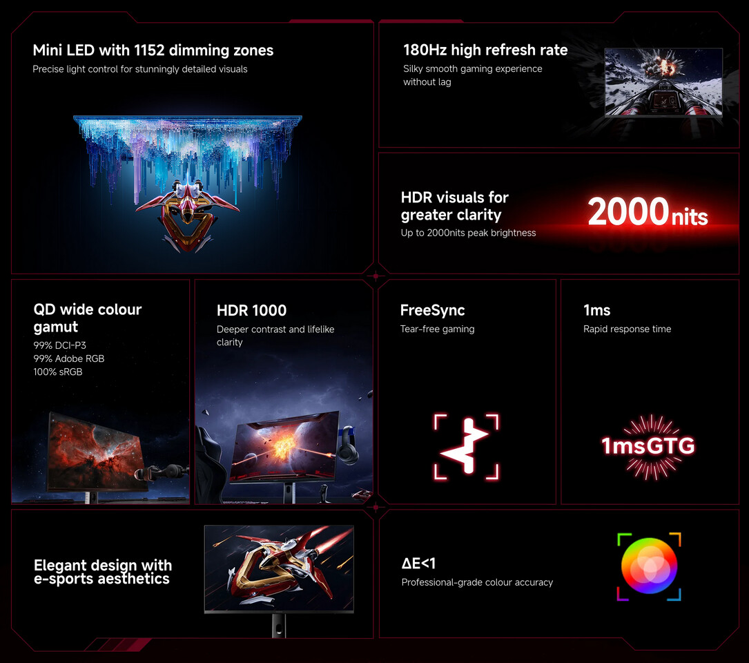Xiaomi также делает акцент на быстродействии и точности цветопередачи. Время отклика заявлено на уровне 1 мс GTG, а охват цветовых пространств достигает 100 % sRGB и 99 % Adobe RGB и DCI-P3. Каждый монитор поставляется с индивидуальным отчётом о калибровке, при этом значение delta-E не превышает 1, что позволяет рассматривать модель не только как игровой, но и как рабочий инструмент для определённых творческих задач.
