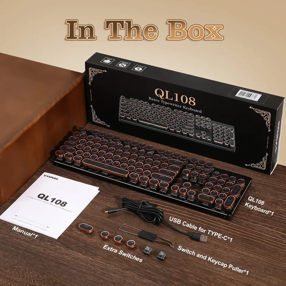 Дизайн QL108 основан на полноразмерном 104-клавишном форм-факторе с выделенным цифровым блоком, что делает ее универсальным выбором для офисных задач, программирования и игр. Главная визуальная особенность — гальванизированные круглые колпачки, которые идеально имитируют внешний вид клавиш старой печатной машинки. Для максимальной функциональности в темноте колпачки выполнены по технологии Shine-Through, позволяющей подсветке просвечивать сквозь символы. Премиальный металлический корпус не только придает клавиатуре элегантный вид, но и обеспечивает высокую устойчивость и долговечность при каждом нажатии.