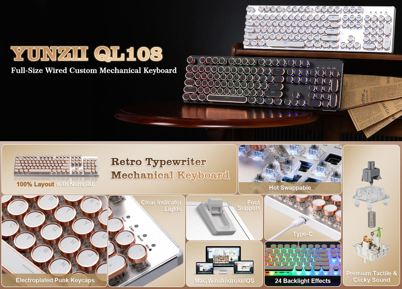 Компания YUNZII представила механическую клавиатуру QL108, которая успешно сочетает ностальгический дизайн классической печатной машинки с самыми востребованными функциями современного игрового и рабочего инструмента. Этот полноразмерный девайс, заключенный в прочный металлический корпус, призван удовлетворить запросы пользователей, ценящих как эстетику, так и высокую производительность.